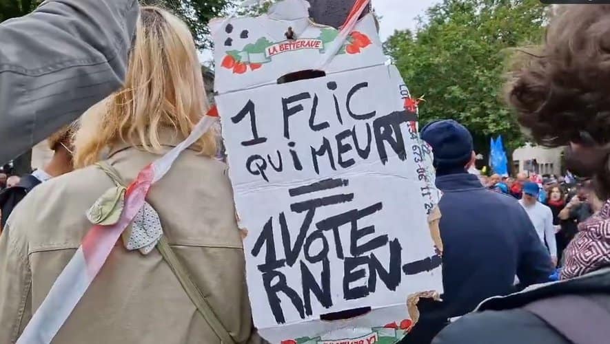 Ce slogan Un flic qui meurt : un vote pour le RN en moins, photographié sur une pancarte au cours d’une manifestation et posté sur le réseau X …